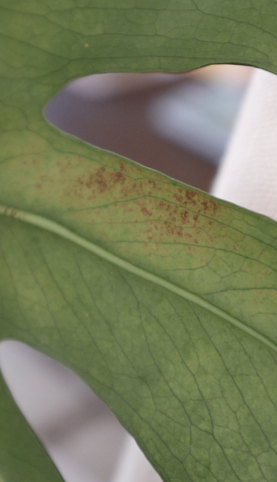 Discolored or distorted leaves: Thrips feed by puncturing plant tissue and sucking out life (insert an Olivia Rodrigo Vampire reference to appear relatable here.) Their feeding process causes leaves to appear silver, beige, or bronze in clustered patches, become distorted, and have a speckled or stippled appearance.